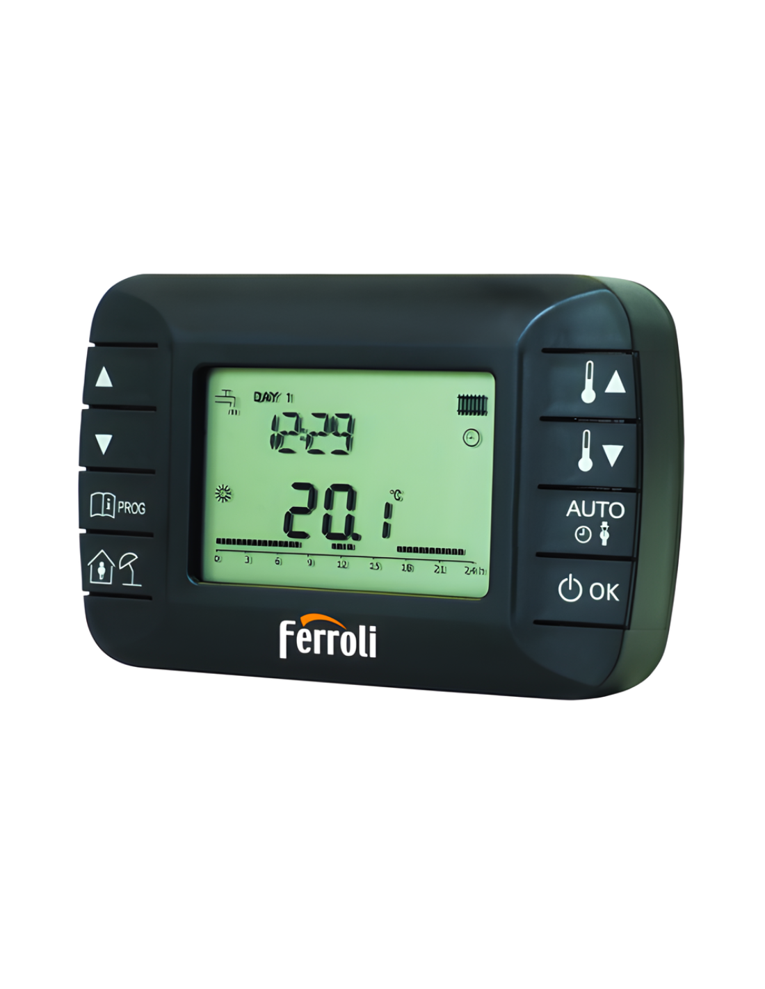 Il design compatto ed elegante permette un’installazione discreta in qualsiasi punto della casa. La comunicazione remota con la caldaia Ferroli consente un controllo avanzato e stabile, migliorando l’efficienza del sistema. Il display intuitivo facilita la configurazione dei parametri e offre una visualizzazione chiara delle impostazioni.