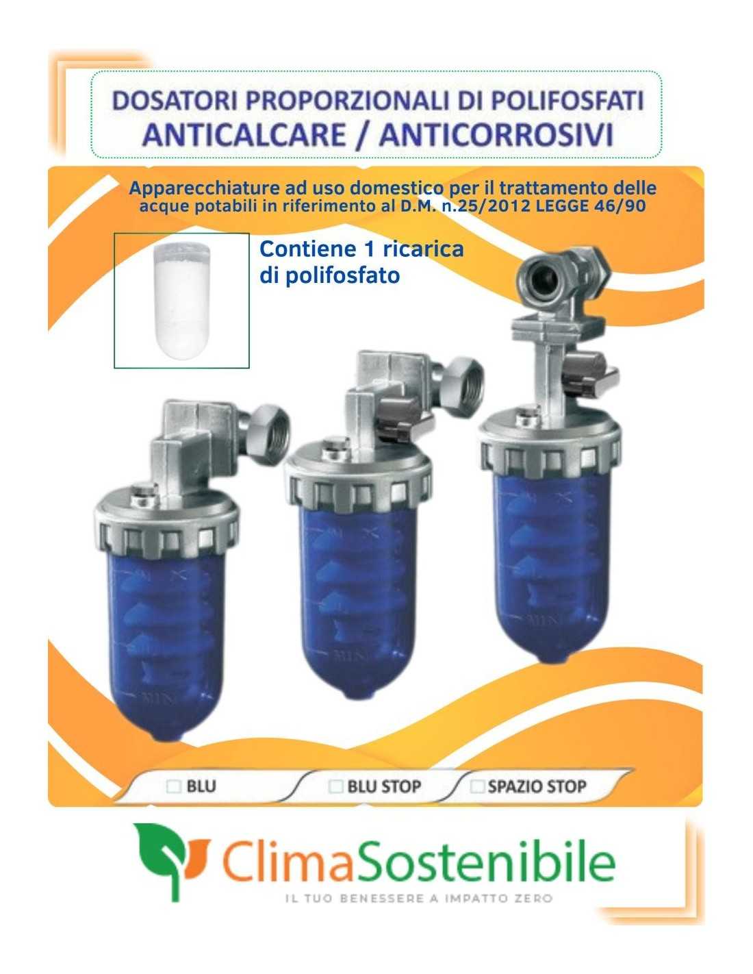 L’ Hidromax Dosatore proporzionale 1/2" Blu Stop è progettato per proteggere gli impianti domestici dall’azione dannosa del calcare e dalla corrosione. Utilizza polifosfati alimentari rilasciati in modo dosato e continuo, impedendo la precipitazione del calcare all’interno delle tubazioni e degli scambiatori delle caldaie. Questo sistema consente di mantenere l’impianto efficiente nel tempo e di ottimizzare i consumi energetici, evitando l’accumulo di incrostazioni che riducono il rendimento.