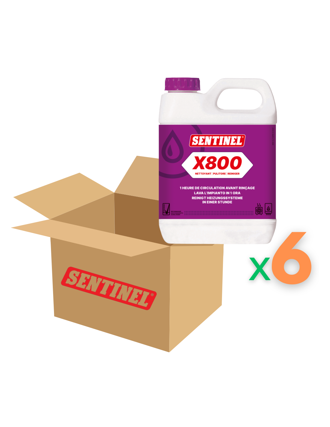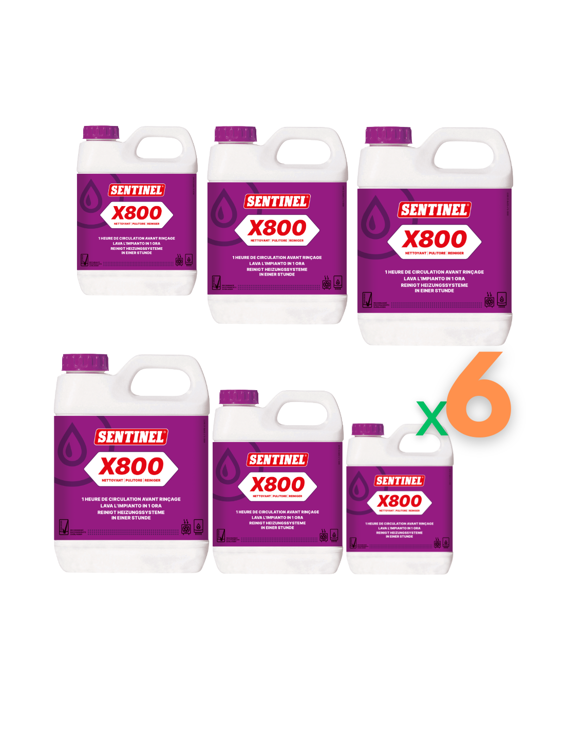 Ogni flacone da 1 litro tratta fino a 100 litri di acqua dell’impianto; la confezione da 6 pezzi copre quindi fino a 600 litri totali, rendendo il prodotto perfetto per installatori, manutentori e tecnici HVAC. L’uso regolare del Sentinel X800 Pulitore garantisce impianti silenziosi, privi di blocchi nei radiatori e con resa ottimale della caldaia o della pompa di calore.