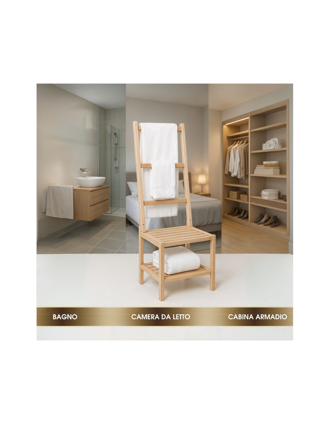La sedia portasciugamani in legno faggio Made in Italy è la soluzione perfetta per chi cerca funzionalità, estetica naturale e qualità artigianale. Realizzata interamente in 100% legno di faggio, questa struttura multifunzione si distingue per il suo design intelligente e salvaspazio: una vera sedia appendiabiti con 2 ripiani capienti e 3 aste orizzontali per appendere o appoggiare asciugamani, accappatoi, abiti, vestiti e accessori.