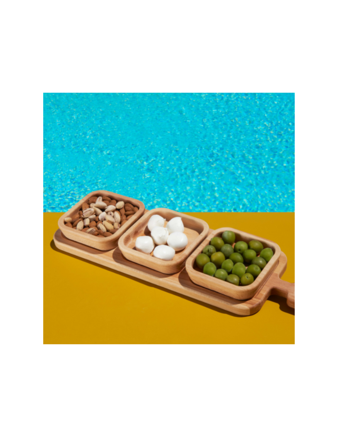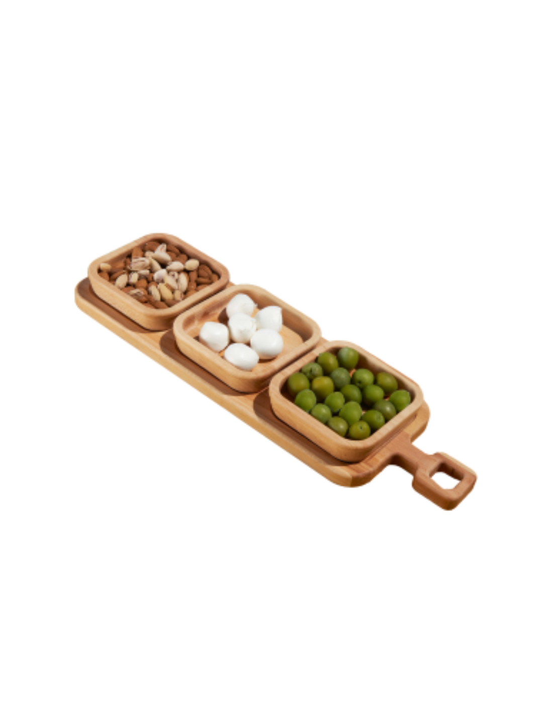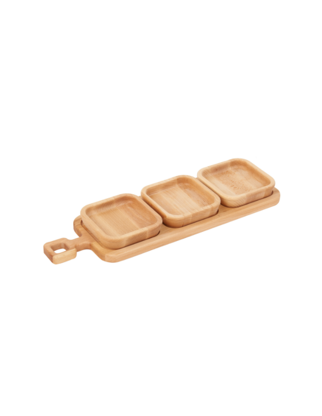 Le tre vaschette estraibili sono ideali per servire aperitivi, salse, condimenti, frutta secca o piccoli snack, permettendo di gestire porzioni e contenuti in modo ordinato. Possono essere rimosse singolarmente per un servizio più comodo o per una pulizia rapida. Il manico integrato rende il vassoio in legno faggio facile da trasportare, perfetto per portare tutto in tavola con un solo gesto.