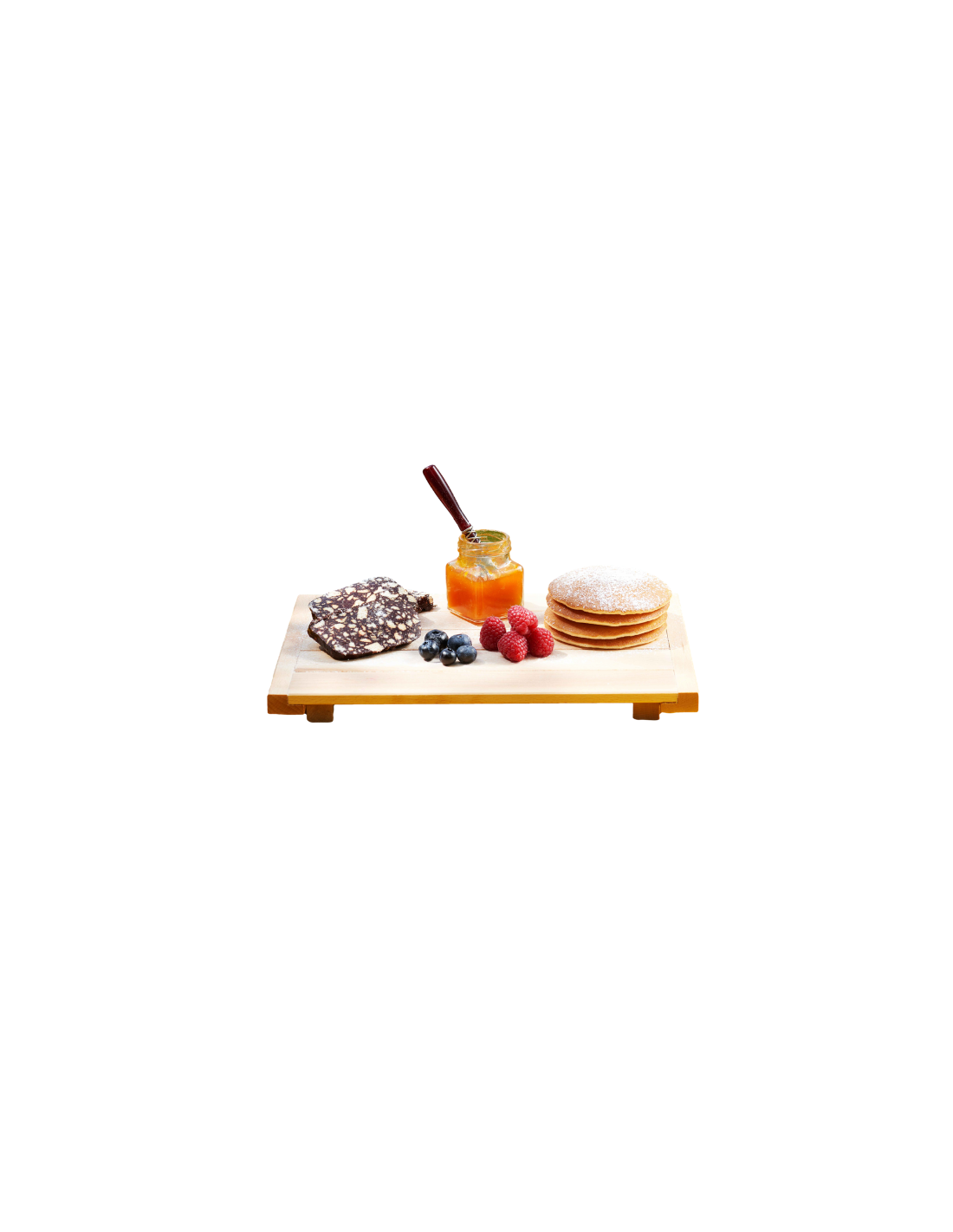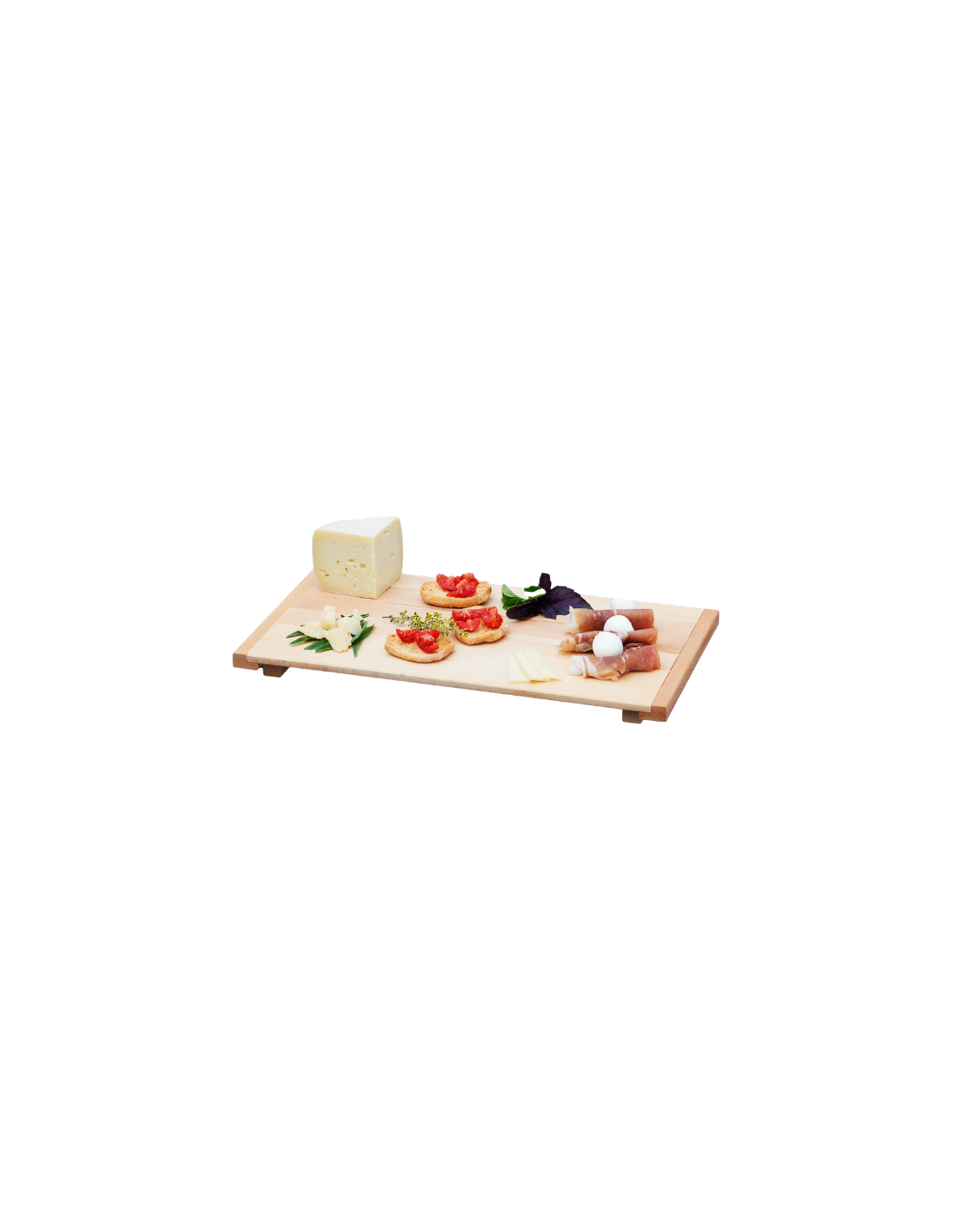 La base del vassoio è composta da doghe di faggio massello unite da traverse robuste, mentre i bordi leggermente rialzati facilitano la presa e il trasporto. Ogni vassoio viene levigato a mano per garantire una superficie liscia e sicura anche a contatto con alimenti.